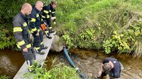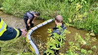 Dabei wurden verschiedene Ölsperren beübt und ausprobiert – einerseits mit einfacher Ausrüstung der Fahrzeuge wie Saugschläuchen und Leitern, andererseits mit speziellem Equipment, das von der FF Schönau ausgeliehen wurde.